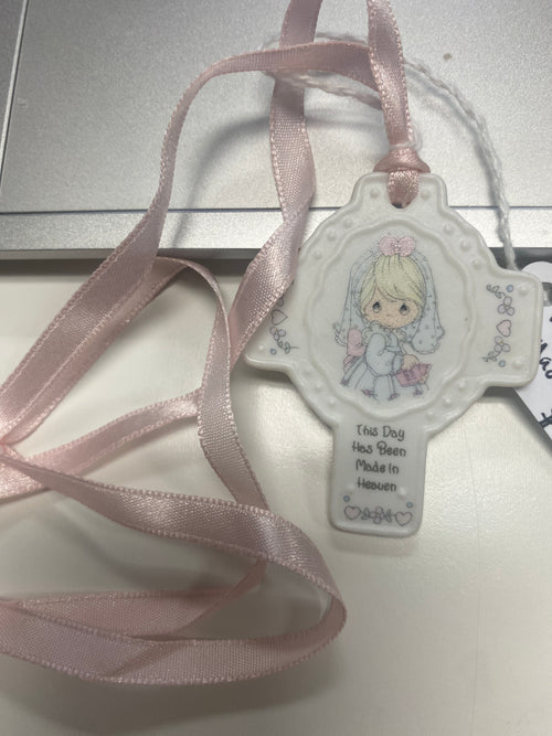 Scented wooden bead rosary with Jerusalem centerpiece and silver-toned chain and crucifix. Rosary is in a plastic round box with Jerusalem art on the front and a prayer on the back. Vintage